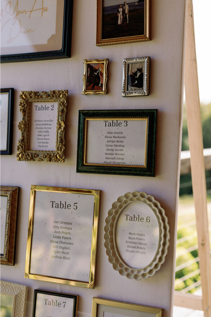 Izzy and Josh included their own little personal touches to a lot of their wedding decor. In addition to Izzy’s handmade “Camp Pete” sign, she also thrifted fun purses for her bridesmaids to match their unique personalities, and they displayed table numbers on a board with unique, vintage picture frames to show guests where to sit, really playing into the rustic wedding venue vibe at Longlook Farm in NH.