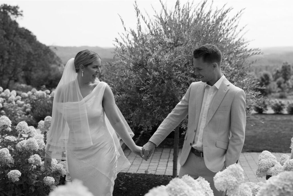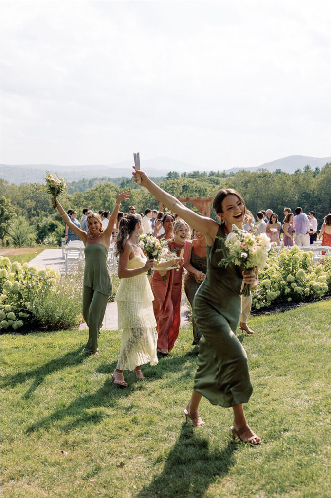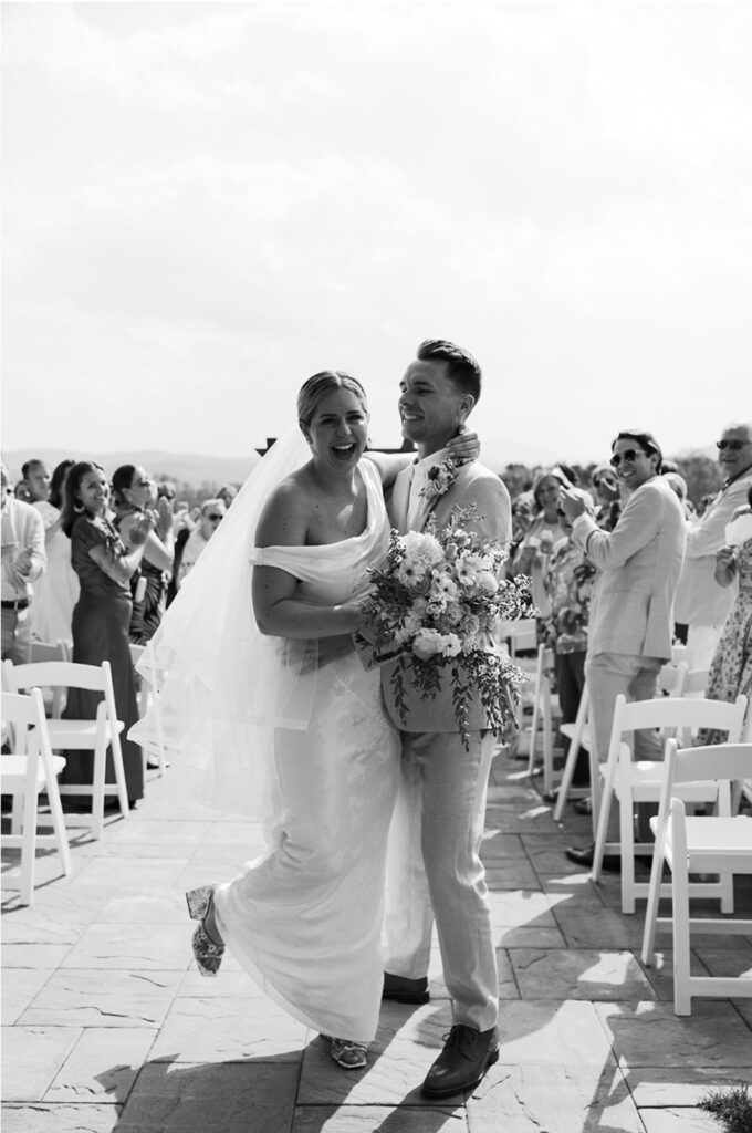 After the outdoor wedding ceremony, their wedding guests cheered as they walked back up the aisle hand-in-hand as newlyweds and headed off to cocktail hour!